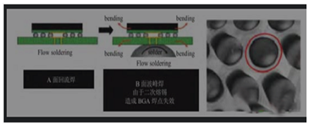 The placement of via holes on the PCB pads will cause solder loss; The high-density PCB assembly must adopt microvia, blind vias or plugging processes to avoid solder loss; As shown in the following picture, it uses wave soldering, and there are vias at the bottom of the BGA. After wave soldering, the solder on the vias affects the reliability of BGA soldering, causing problems such as short circuits of components.