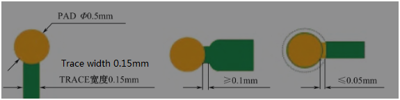 The lead wire of the BGA pad should not exceed 50% of the diameter of the pad, and the lead wire of the power supply pad should not be less than 0.1mm, and then thicken it. In order to prevent deformation of the pad, the solder mask window should not be larger than 0.05mm, as shown in the following picture.
