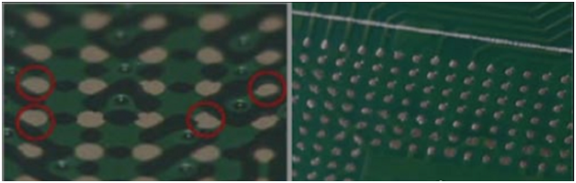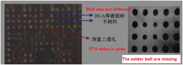 There are via holes in the BGA pad, and the solder balls are lost with the solder during the soldering process; The PCB manufacturing does not implement the solder mask process, and causes the loss of solder and solder balls through the vias adjacent to the pad, resulting in the solder balls missing, as shown in the following picture.